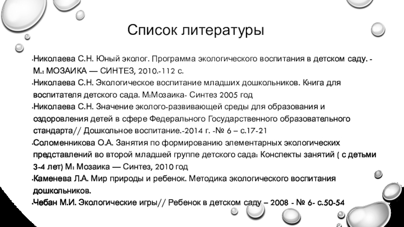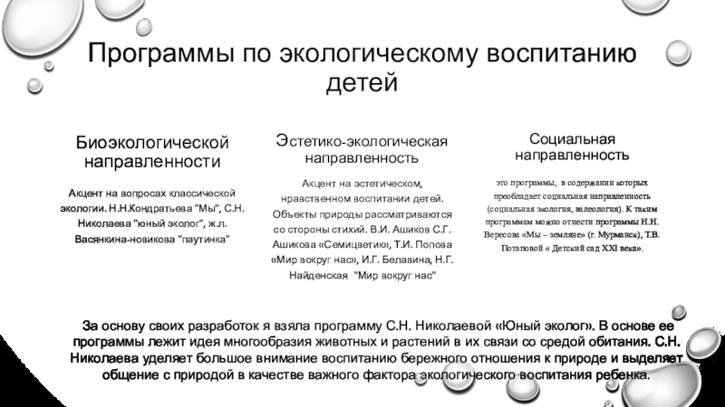 Акцент на вопросах классической экологии. Н.Н.Кондратьева "Мы", С.Н.Николаева "юный эколог", ж.л. Васянкина-новикова "паутинка"