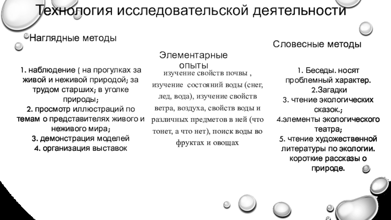изучение свойств почвы , изучение состояний воды (снег, лед, вода), изучение свойств ветра, воздуха, свойств воды и различных предметов в ней (что тонет, а что нет), поиск воды во фруктах и овощах
