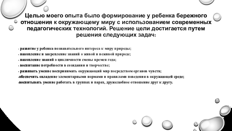 За основу своих разработок я взяла программу С.Н. Николаевой «Юный эколог». В основе ее программы лежит идея многообразия животных и растений в их связи со средой обитания. С.Н. Николаева уделяет большое внимание воспитанию бережного отношения к природе и выделяет общение с природой в качестве важного фактора экологического воспитания ребенка.