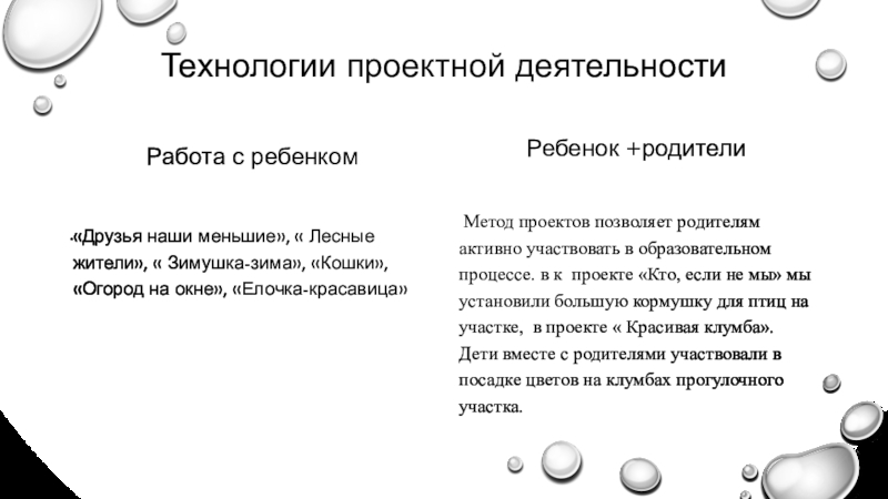 Метод проектов позволяет родителям активно участвовать в образовательном процессе. в к проекте «Кто, если не мы» мы установили большую кормушку для птиц на участке, в проекте « Красивая клумба». Дети вместе с родителями участвовали в посадке цветов на клумбах прогулочного участка.
