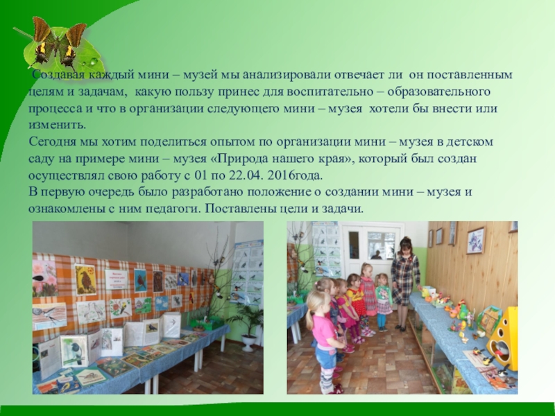 Сегодня мы хотим поделиться опытом по организации мини – музея в детском саду на примере мини – музея «Природа нашего края», который был создан осуществлял свою работу с 01 по 22.04. 2016года.