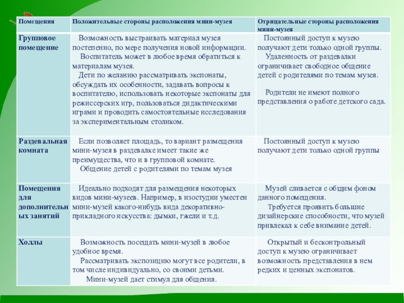 В любом детском саду существует проблема свободных помещений. Для расположения мини-музеев можно использовать различные части групповых комнат, «раздевалок», спальных комнат, стены у входа в группу, лестничные площадки и т.п.. Место расположения мини – музея имеет как положительные, так и отрицательные стороны.