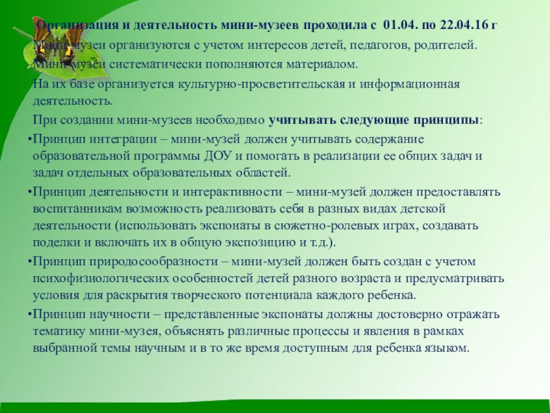 Слайд 9 Организация и деятельность мини-музеев проходила с 01.04. по 22.04.16 г