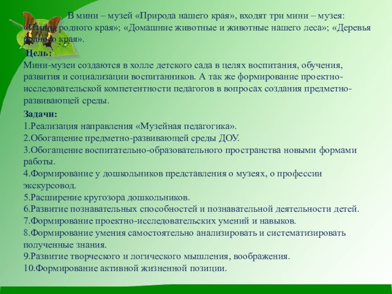 В мини – музей «Природа нашего края», входят три мини – музея: «Птицы родного края»; «Домашние животные и животные нашего леса»; «Деревья родного края».