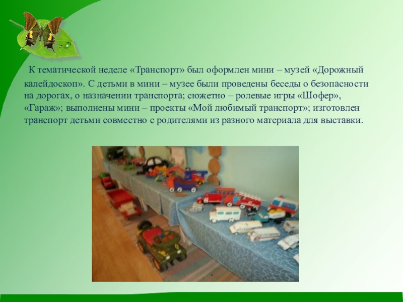 Слайд 5 К тематической неделе «Транспорт» был оформлен мини – музей «Дорожный