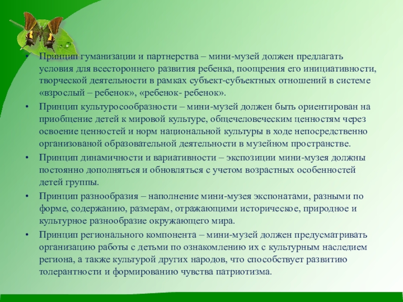 Принцип природосообразности – мини-музей должен быть создан с учетом психофизиологических особенностей детей разного возраста и предусматривать условия для раскрытия творческого потенциала каждого ребенка.