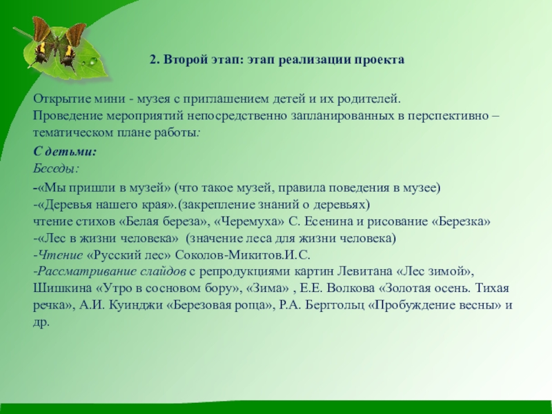 -Рассматривание слайдов с репродукциями картин Левитана «Лес зимой», Шишкина «Утро в сосновом бору», «Зима» , Е.Е. Волкова «Золотая осень. Тихая речка», А.И. Куинджи «Березовая роща», Р.А. Берггольц «Пробуждение весны» и др.