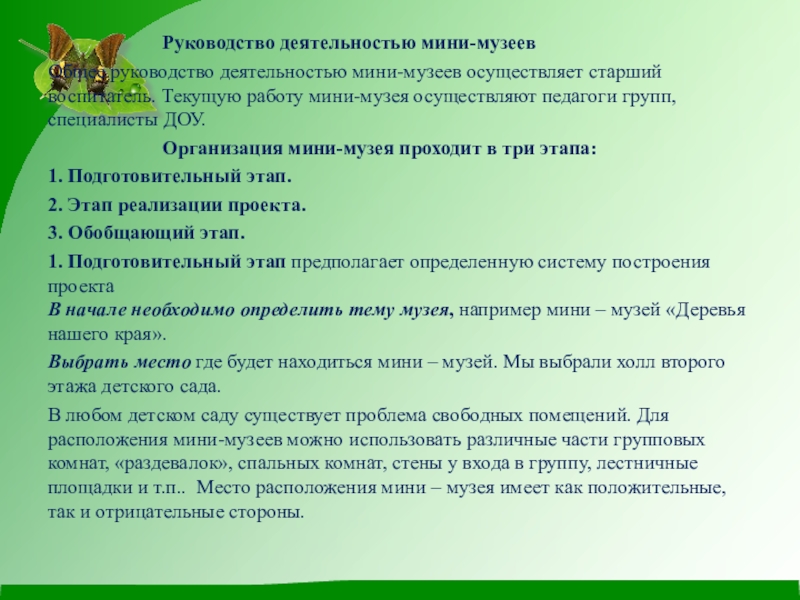 Общее руководство деятельностью мини-музеев осуществляет старший воспитатель. Текущую работу мини-музея осуществляют педагоги групп, специалисты ДОУ.