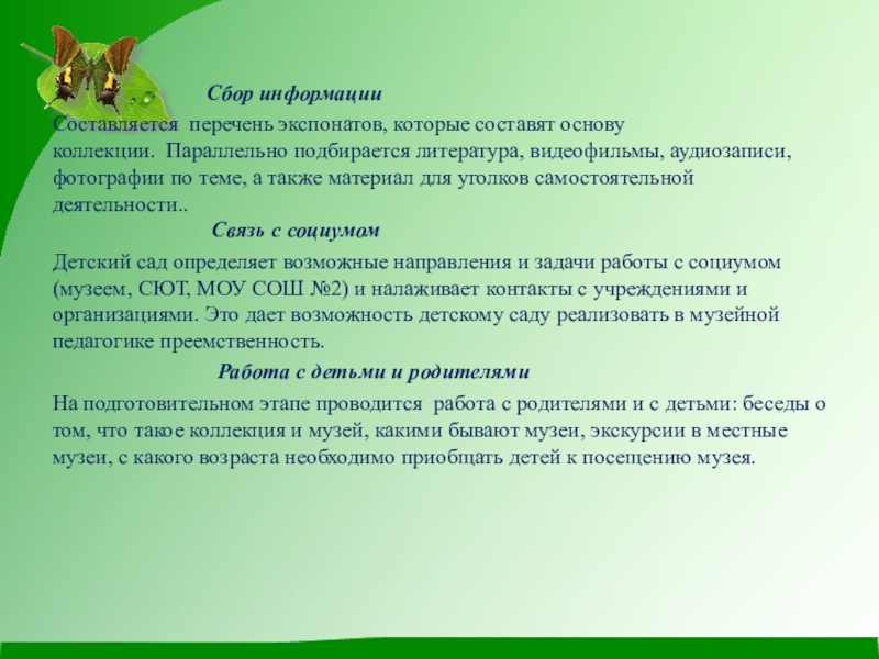 Составляется перечень экспонатов, которые составят основу коллекции. Параллельно подбирается литература, видеофильмы, аудиозаписи, фотографии по теме, а также материал для уголков самостоятельной деятельности..