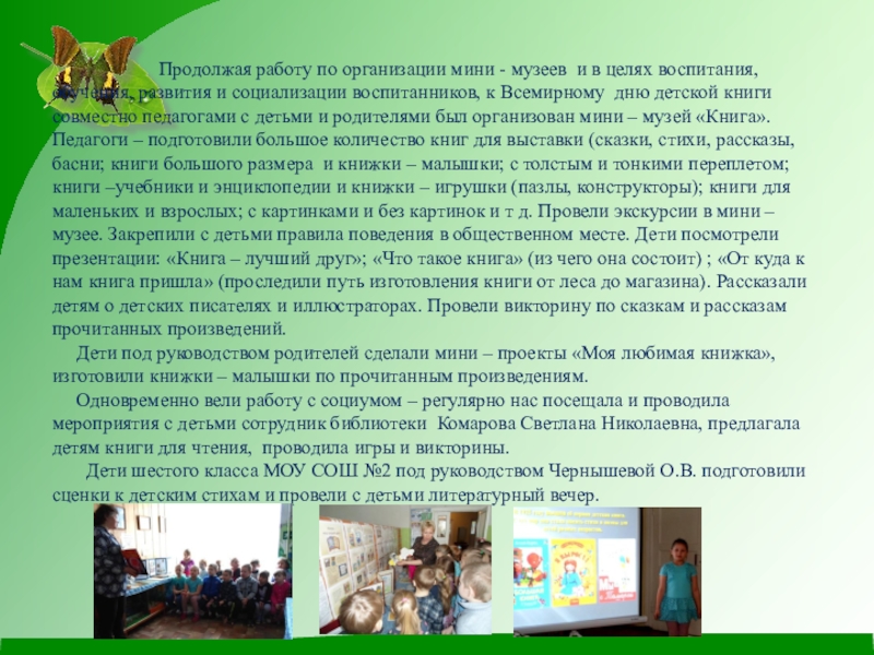 Продолжая работу по организации мини - музеев и в целях воспитания, обучения, развития и социализации воспитанников, к Всемирному дню детской книги совместно педагогами с детьми и родителями был организован мини – музей «Книга». Педагоги – подготовили большое количество книг для выставки (сказки, стихи, рассказы, басни; книги большого размера и книжки – малышки; с толстым и тонкими переплетом; книги –учебники и энциклопедии и книжки – игрушки (пазлы, конструкторы); книги для маленьких и взрослых; с картинками и без картинок и т д. Провели экскурсии в мини – музее. Закрепили с детьми правила поведения в общественном месте. Дети посмотрели презентации: «Книга – лучший друг»; «Что такое книга» (из чего она состоит) ; «От куда к нам книга пришла» (проследили путь изготовления книги от леса до магазина). Рассказали детям о детских писателях и иллюстраторах. Провели викторину по сказкам и рассказам прочитанных произведений.