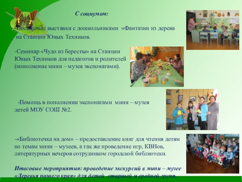 Детский сад определяет возможные направления и задачи работы с социумом (музеем, СЮТ, МОУ СОШ №2) и налаживает контакты с учреждениями и организациями. Это дает возможность детскому саду реализовать в музейной педагогике преемственность.