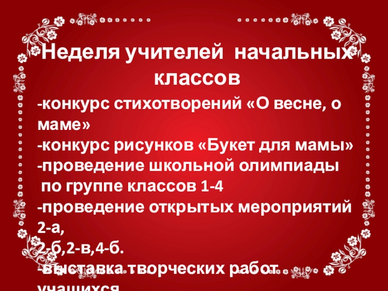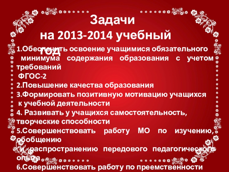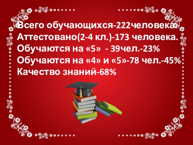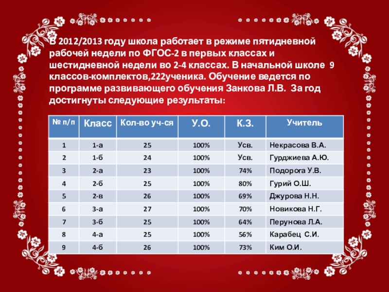 ФГОС-2 в первых классах и шестидневной недели во 2-4 классах. В начальной школе 9 классов-комплектов,222ученика. Обучение ведется по программе развивающего обучения Занкова Л.В. За год достигнуты следующие результаты: