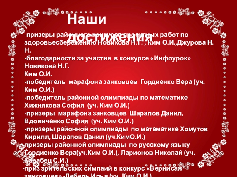 -призеры районного конкурса проектных работ по здоровьесбережению Новикова Н.Г. ,