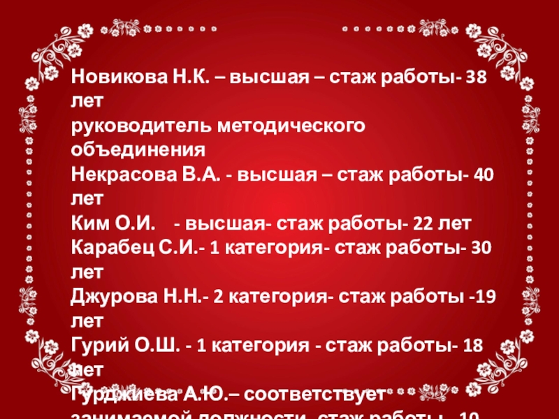 Слайд 4Новикова Н.К. – высшая – стаж работы- 38 лет