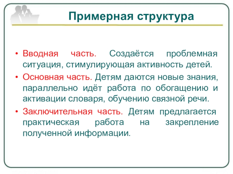 Вводная часть. Создаётся проблемная ситуация, стимулирующая активность детей.