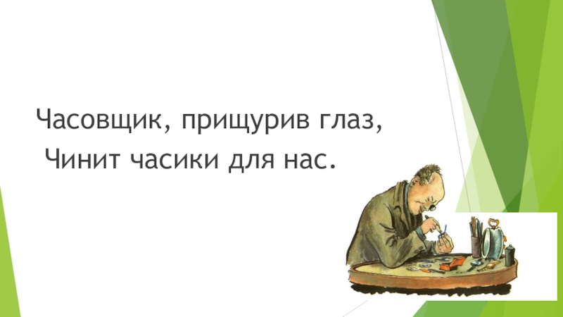 Часовщик, прищурив глаз, Чинит часики для нас.