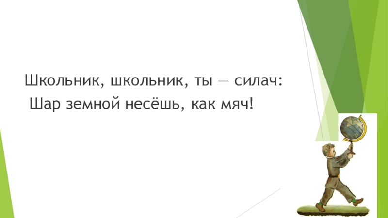 Школьник, школьник, ты — силач: Шар земной несёшь, как мяч!