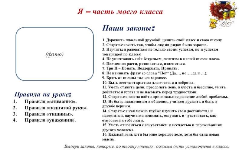 Выбери законы, которые, по твоему мнению, должны быть установлены в классе.