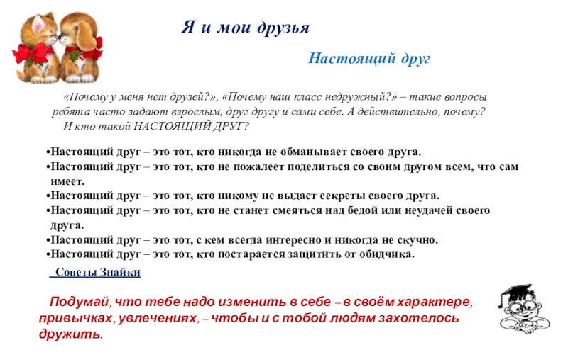 Подумай, что тебе надо изменить в себе – в своём характере, привычках, увлечениях, – чтобы и с тобой людям захотелось дружить.