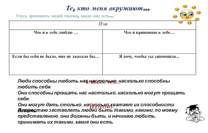 Я перестаю заставлять людей быть такими, какими, по моему представлению, они должны быть, и начинаю любить, принимать их такими, какие они есть.