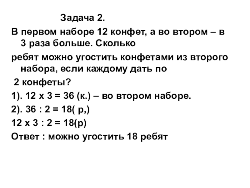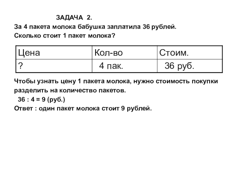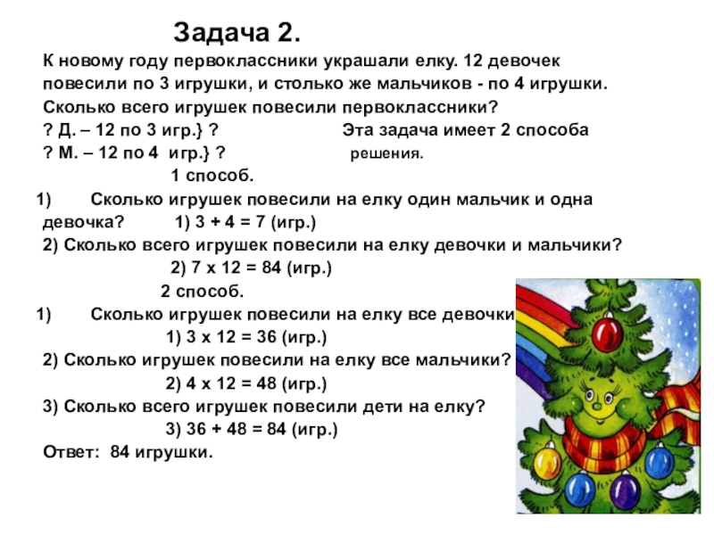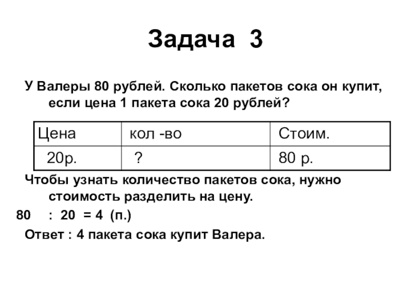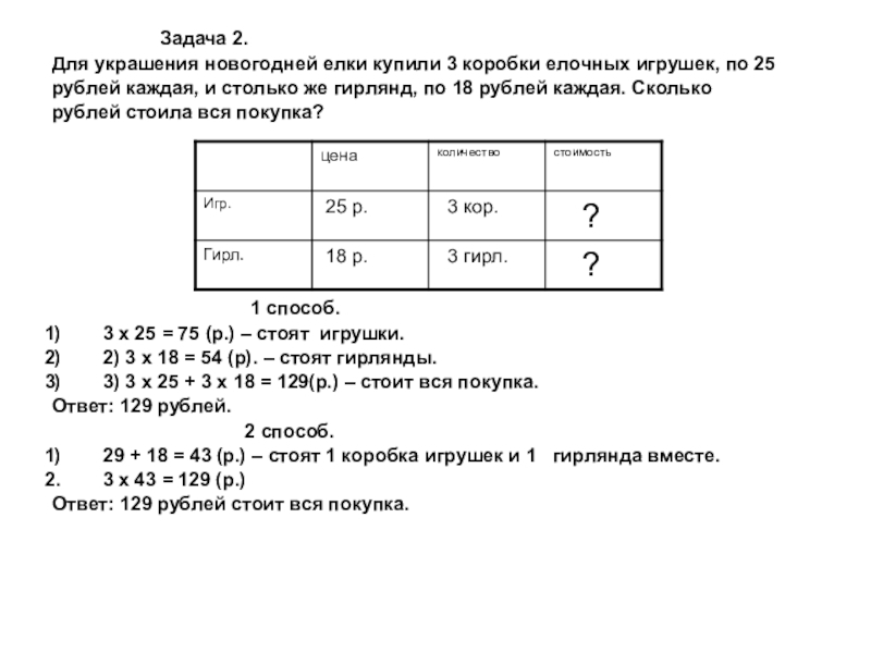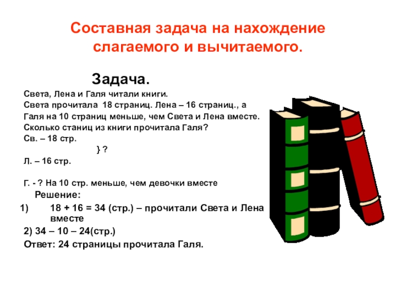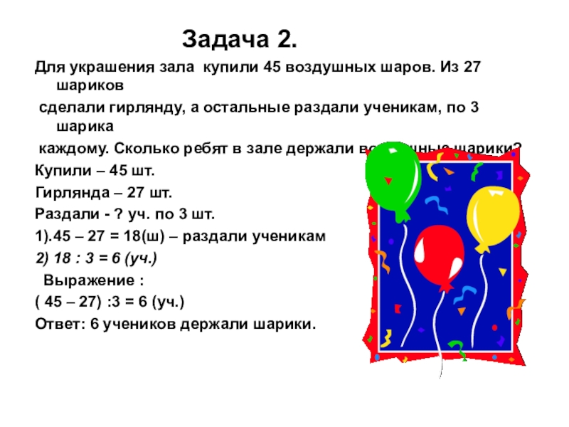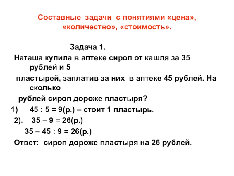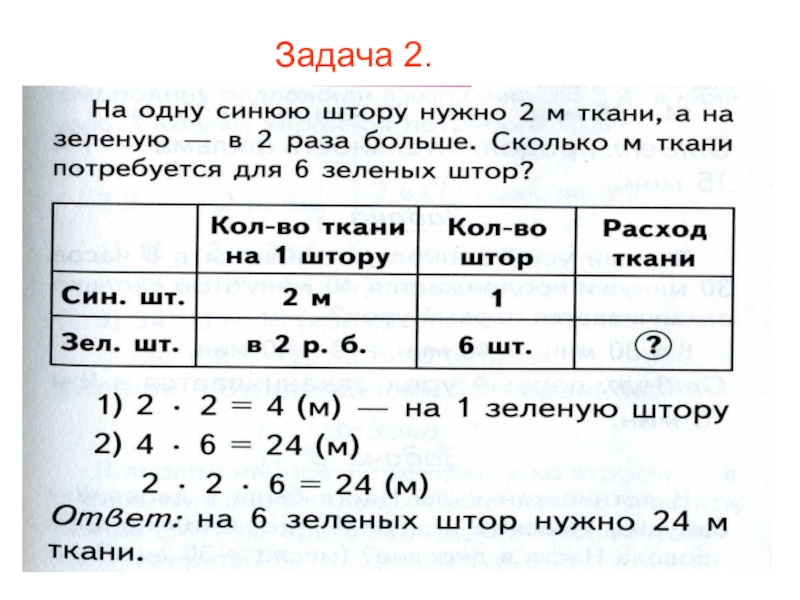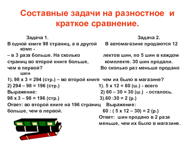 данных, чтобы сразу ответить на вопрос задачи. Эти задачи состоят из двух или более действий. Составные задачи можно решать по действиям и выражениями.