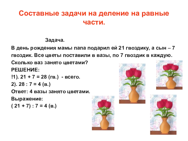 Слайд 10ПРОСТЫЕ ЗАДАЧИ НА ДЕЛЕНИЕ НА РАВНЫЕ ЧАСТИ.