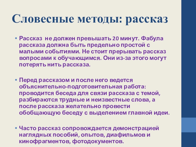 быть предельно простой с малыми событиями. Не стоит прерывать рассказ вопросами к обучающимся. Они из-за этого могут потерять нить рассказа.