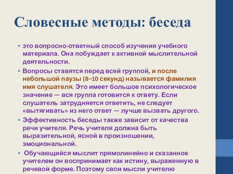 Эффективность беседы также зависит от качества речи учителя. Речь учителя должна быть выразительной, ясной в произношении, эмоциональной.