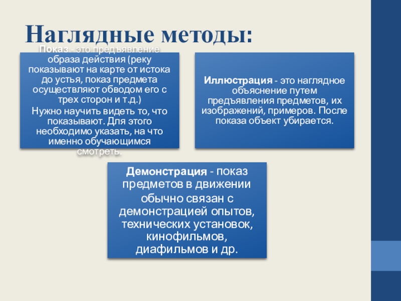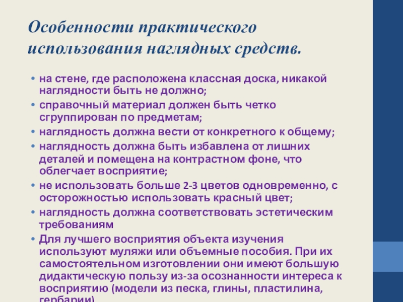 При объяснении должны хорошо использоваться различные средства наглядности, которые способствуют вскрытию существенных сторон, изучаемых тем, положений, процессов, явлений и событий.