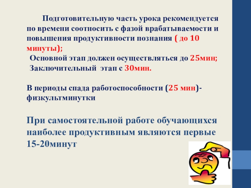 Слайд 9 Подготовительную часть урока рекомендуется по времени соотносить с фазой врабатываемости и