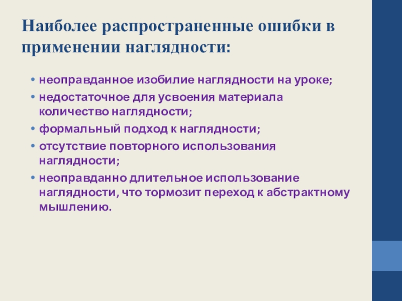 неоправданно длительное использование наглядности, что тормозит переход к абстрактному мышлению.