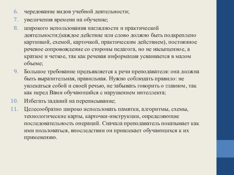 деятельности;(каждое действие или слово должно быть подкреплено картинкой, схемой, карточкой, практическим действием), постоянное речевое сопровождение со стороны педагога, но не насыщенное, а краткое и четкое, так как речевая информация усваивается в малом объеме;