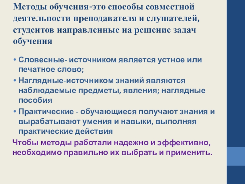 Слайд 11Методы обучения-это способы совместной деятельности преподавателя и слушателей, студентов направленные на