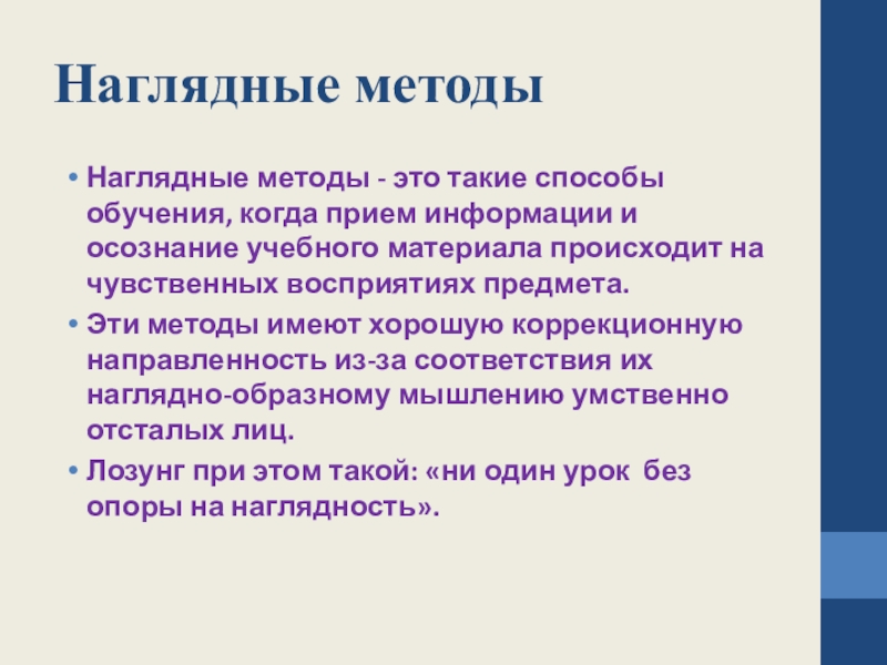 Эти методы имеют хорошую коррекционную направленность из-за соответствия их наглядно-образному мышлению умственно отсталых лиц.