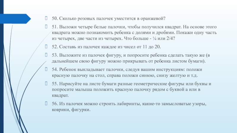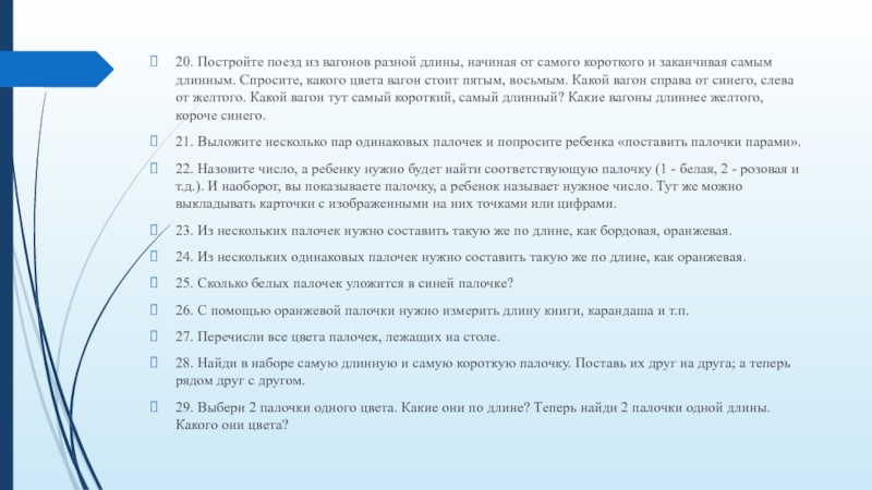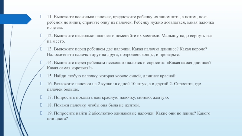 19. Попросите найти 2 абсолютно одинаковые палочки. Какие они по длине? Какого они цвета?