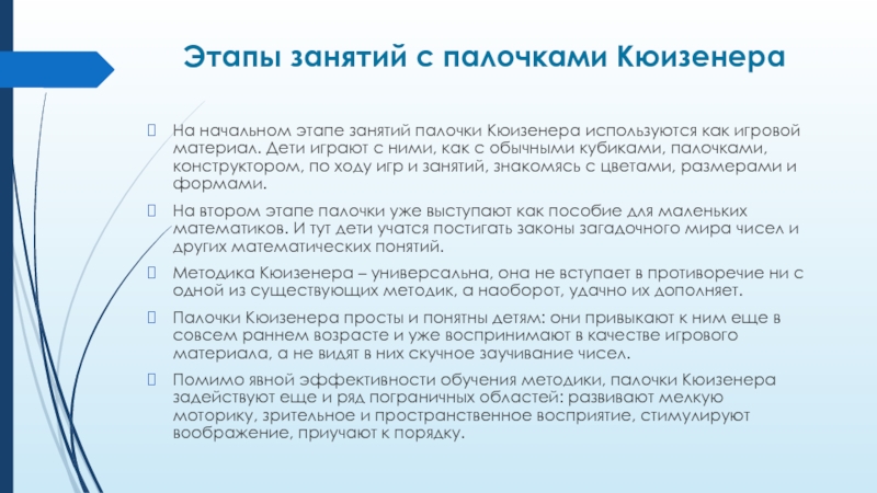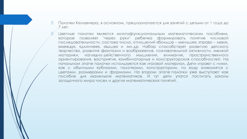 Цветные палочки являются многофункциональным математическим пособием, которое позволяет "через руки" ребенка формировать понятие числовой последовательности, состава числа, отношений «больше – меньше», «право – лево», «между», «длиннее», «выше» и мн.др. Набор способствует развитию детского творчества, развития фантазии и воображения, познавательной активности, мелкой моторики, наглядно-действенного мышления, внимания, пространственного ориентирования, восприятия, комбинаторных и конструкторских способностей. На начальном этапе палочки используются как игровой материал. Дети играют с ними, как с обычными кубиками, палочками, конструктором, по ходу знакомятся с цветами, размерами и формами. На втором этапе палочки уже выступают как пособие для маленьких математиков. И тут дети учатся постигать законы загадочного мира чисел и других математических понятий.