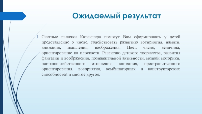 Помимо явной эффективности обучения методики, палочки Кюизенера задействуют еще и ряд пограничных областей: развивают мелкую моторику, зрительное и пространственное восприятие, стимулируют воображение, приучают к порядку.