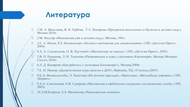5.В. П. Новикова, Л. И. Тихонова «Развивающие и игры с палочками Кюизенера», Москва Мозаика-Синтез, 2010г.