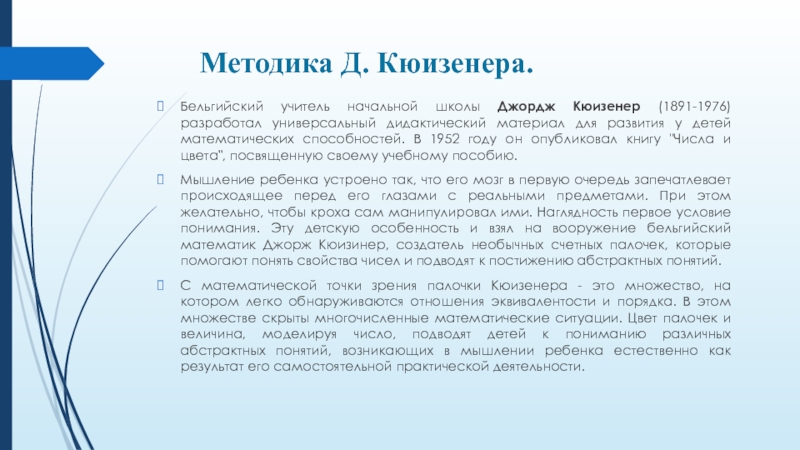 дидактический материал для развития у детей математических способностей. В 1952 году он опубликовал книгу "Числа и цвета", посвященную своему учебному пособию.