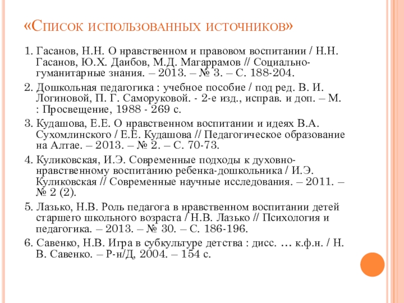 5. Лазько, Н.В. Роль педагога в нравственном воспитании детей старшего школьного возраста / Н.В. Лазько // Психология и педагогика. – 2013. – № 30. – С. 186-196.