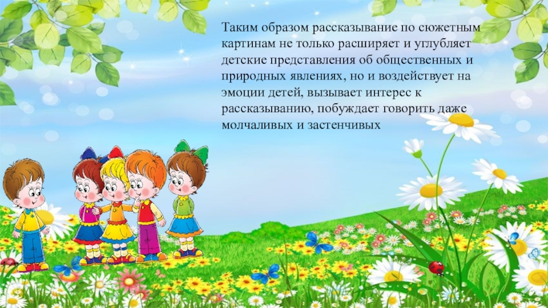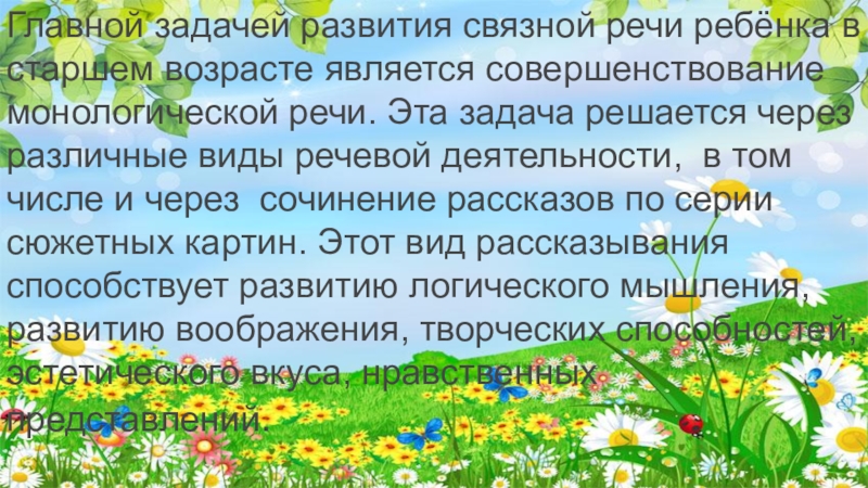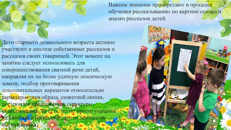 Дети старшего дошкольного возраста активно участвуют в анализе собственных рассказов и рассказов своих товарищей. Этот момент на занятии следует использовать для совершенствования связной речи детей, направляя их на более удачную лексическую замену, подбор проговаривания дополнительных вариантов относительно характеристики образа, сюжетной линии, построения предложения, структуры повествования. То есть это не просто указание на ошибки, а признание других вариантов высказывания.
