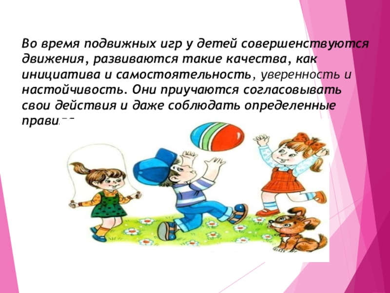 Слайд 3Во время подвижных игр у детей совершенствуются движения, развиваются такие качества,