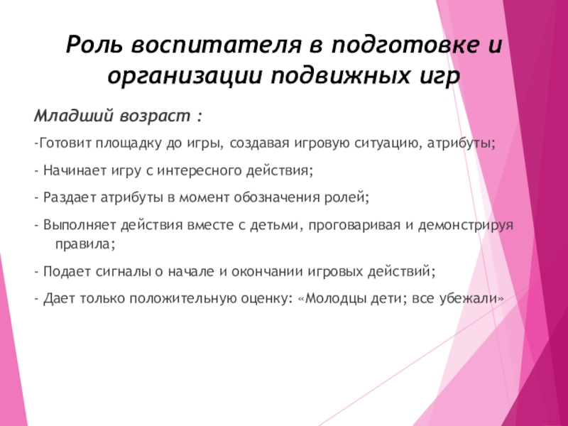 Слайд 10Роль воспитателя в подготовке и организации подвижных игр