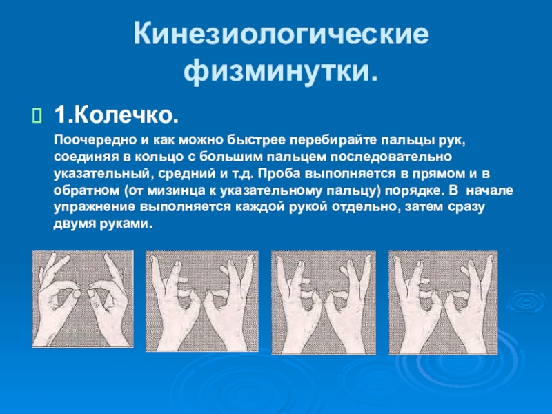пальцы рук, соединяя в кольцо с большим пальцем последовательно указательный, средний и т.д. Проба выполняется в прямом и в обратном (от мизинца к указательному пальцу) порядке. В начале упражнение выполняется каждой рукой отдельно, затем сразу двумя руками.