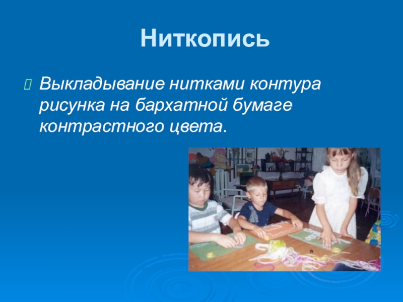 Выкладывание нитками контура рисунка на бархатной бумаге контрастного цвета.