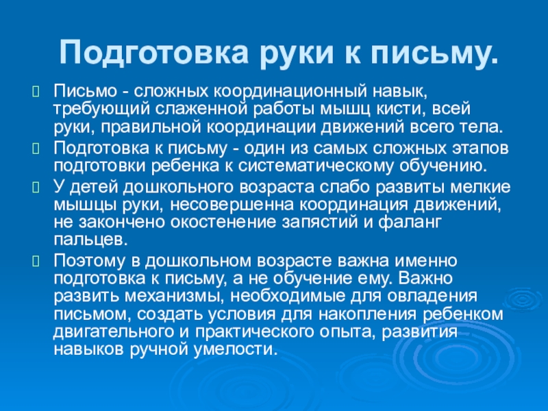 У детей дошкольного возраста слабо развиты мелкие мышцы руки, несовершенна координация движений, не закончено окостенение запястий и фаланг пальцев.