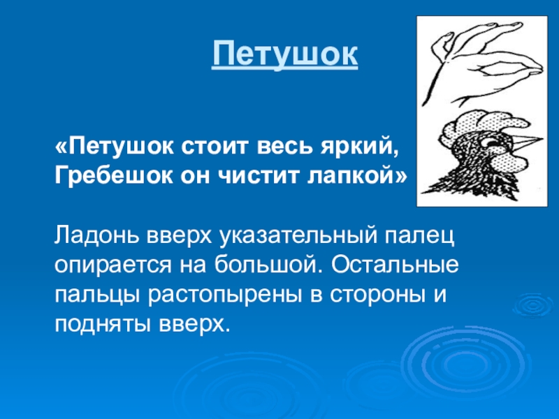 Курочка. Соединить концы большого и указательного пальцев (клюв). На клюв веерообразно накладываются друг на дружку остальные пальцы - это гребешок.