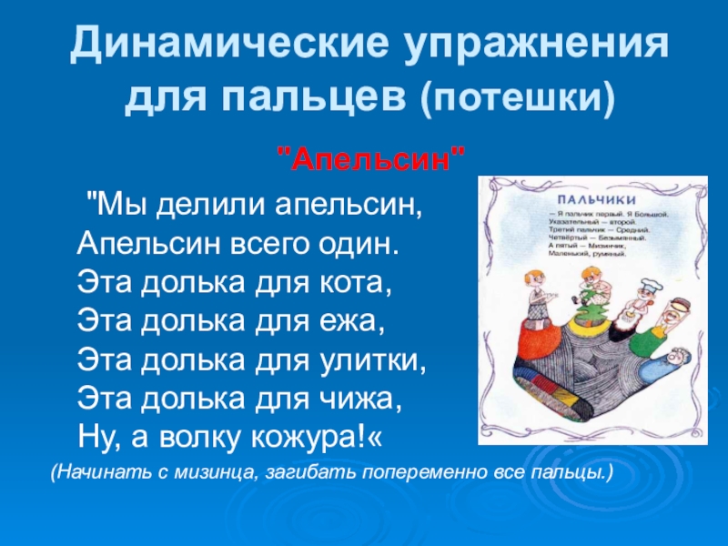 Слайд 6Динамические упражнения для пальцев (потешки)