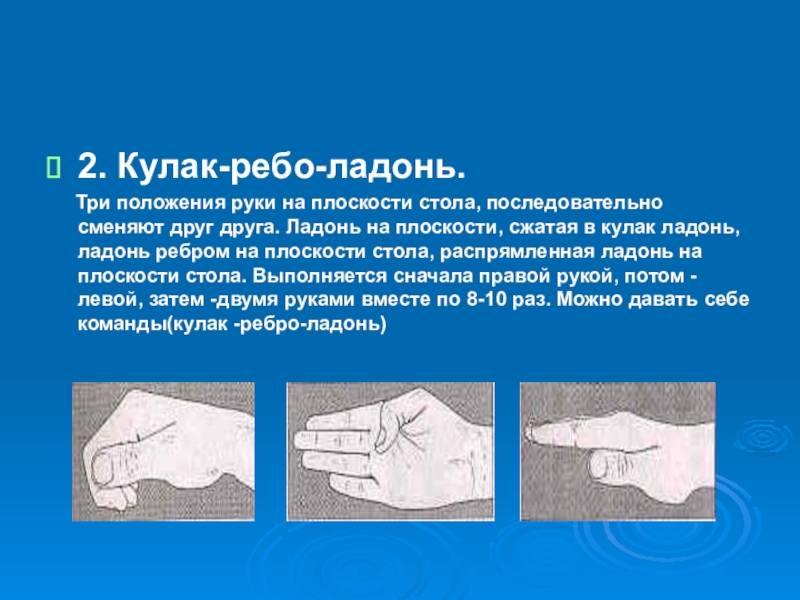 сменяют друг друга. Ладонь на плоскости, сжатая в кулак ладонь, ладонь ребром на плоскости стола, распрямленная ладонь на плоскости стола. Выполняется сначала правой рукой, потом -левой, затем -двумя руками вместе по 8-10 раз. Можно давать себе команды(кулак -ребро-ладонь)