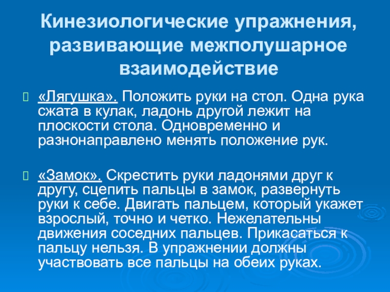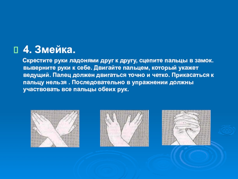 пальцы в замок. выверните руки к себе. Двигайте пальцем, который укажет ведущий. Палец должен двигаться точно и четко. Прикасаться к пальцу нельзя . Последовательно в упражнении должны участвовать все пальцы обеих рук.